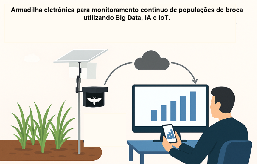 No experimento conduzido entre janeiro e abril de 2025, os pesquisadores instalaram uma armadilha eletrônica em um talhão de cana, no Distrito Agrotecnológico de Alto Alegre. O equipamento, desenvolvido pela empresa parceira Elsys, realizou a captura e contagem diária dos adultos da broca, transmitindo os dados para uma plataforma digital. Com isso, foi possível identificar picos populacionais e calcular o nível de risco de dano em tempo real.